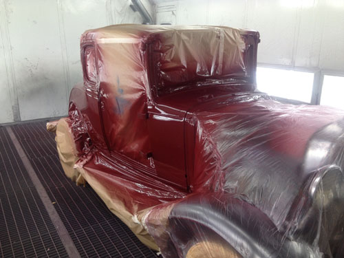Ég var strax staðráðin í að gefa bílnum ögn líflegri lit en svart og hér er verið að bera við bílinn litaprufu af rauðum lit sem ég var að spá í að setja á bílinn.